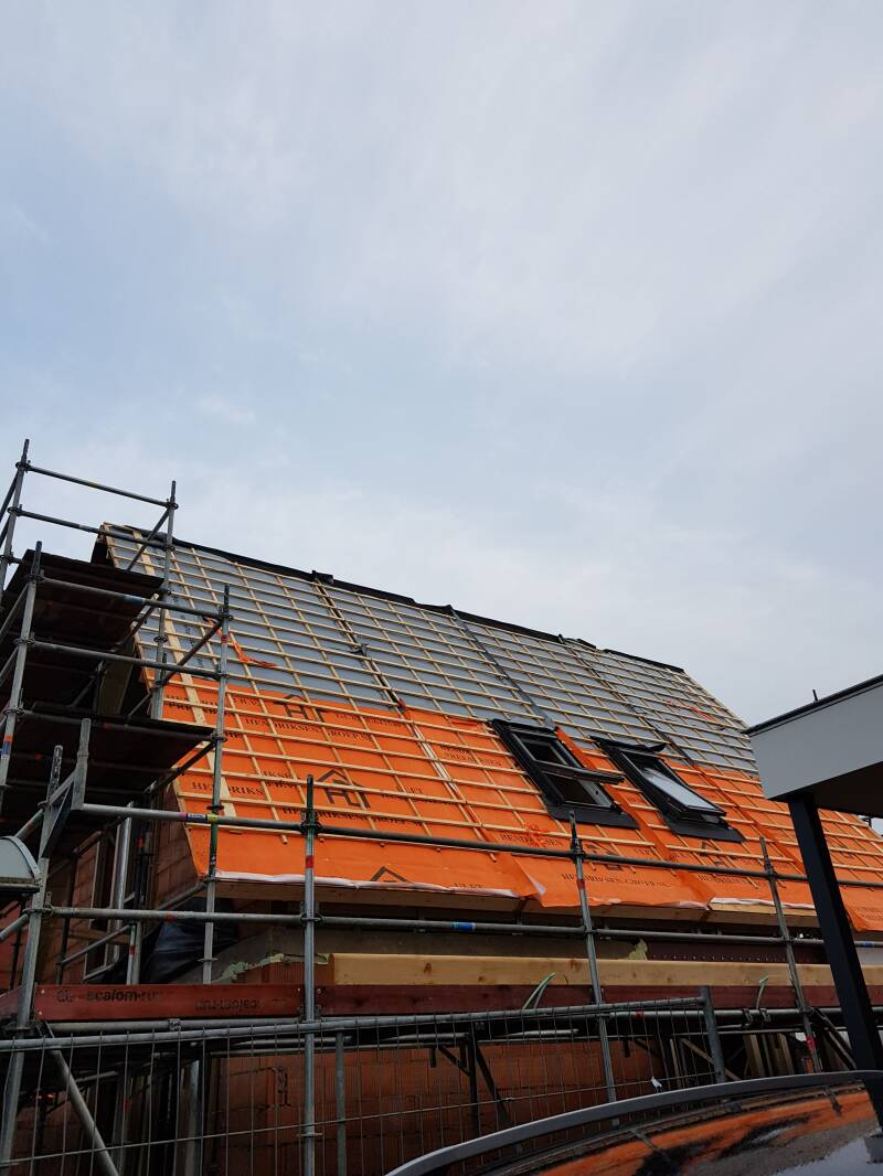 Vorige week zaterdag waren we nog wezen kijken en maandagavond kreeg ik een appje van onze toekomstige buurman dat het dak er al op zit! Afgelopen week zijn we wezen kijken en hebben we wat foto's gemaakt. Dat gaat ineens erg snel. Ze werken nog tot en met volgende week vrijdag en dan is het 2 weken vakantie. Mooi dat het nu waterdicht is.